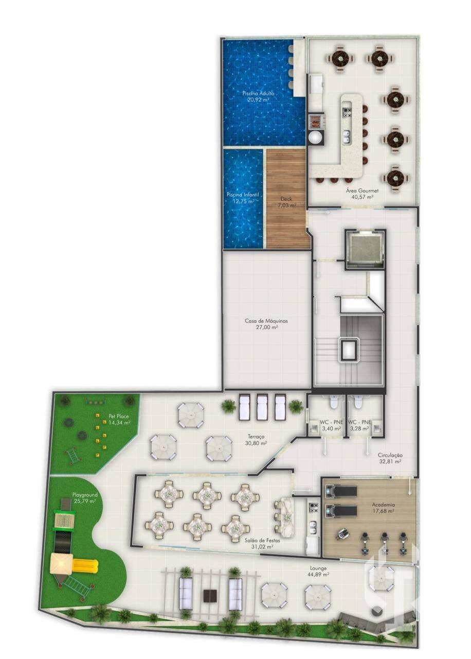 O lazer é um espetáculo à parte: piscinas adulto e infantil de frente para o mar, bar molhado, lounge, playground, sala de jogos, PUB, salão de festas, academia e pet place, tudo em 379 m² de área mobiliada e decorada, ideal para criar memórias inesquecíveis com a família e amigos.